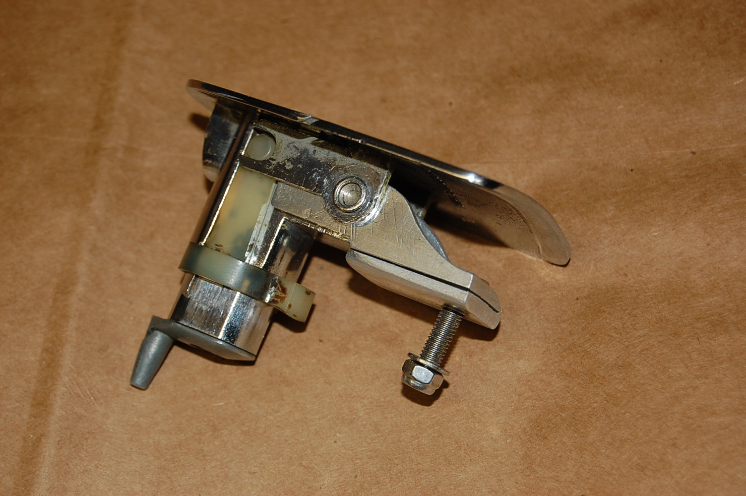 im dealing with the same issue. I'll be cutting the nut off. Once I get it apart, hoping to fix the stud with a bonding adhesive. One solution I read about here, is a flat head screw (head exposed on the outside). That could work (IMG:style_emoticons/default/beerchug.gif) I would think good old JB Weld would hold it tight. Does anyone know how these things are attached at the factory? Looking at my good one, It kind of looks like the stud has a button head that was press fit into the tab prior to plating. But I can't really tell for sure. |