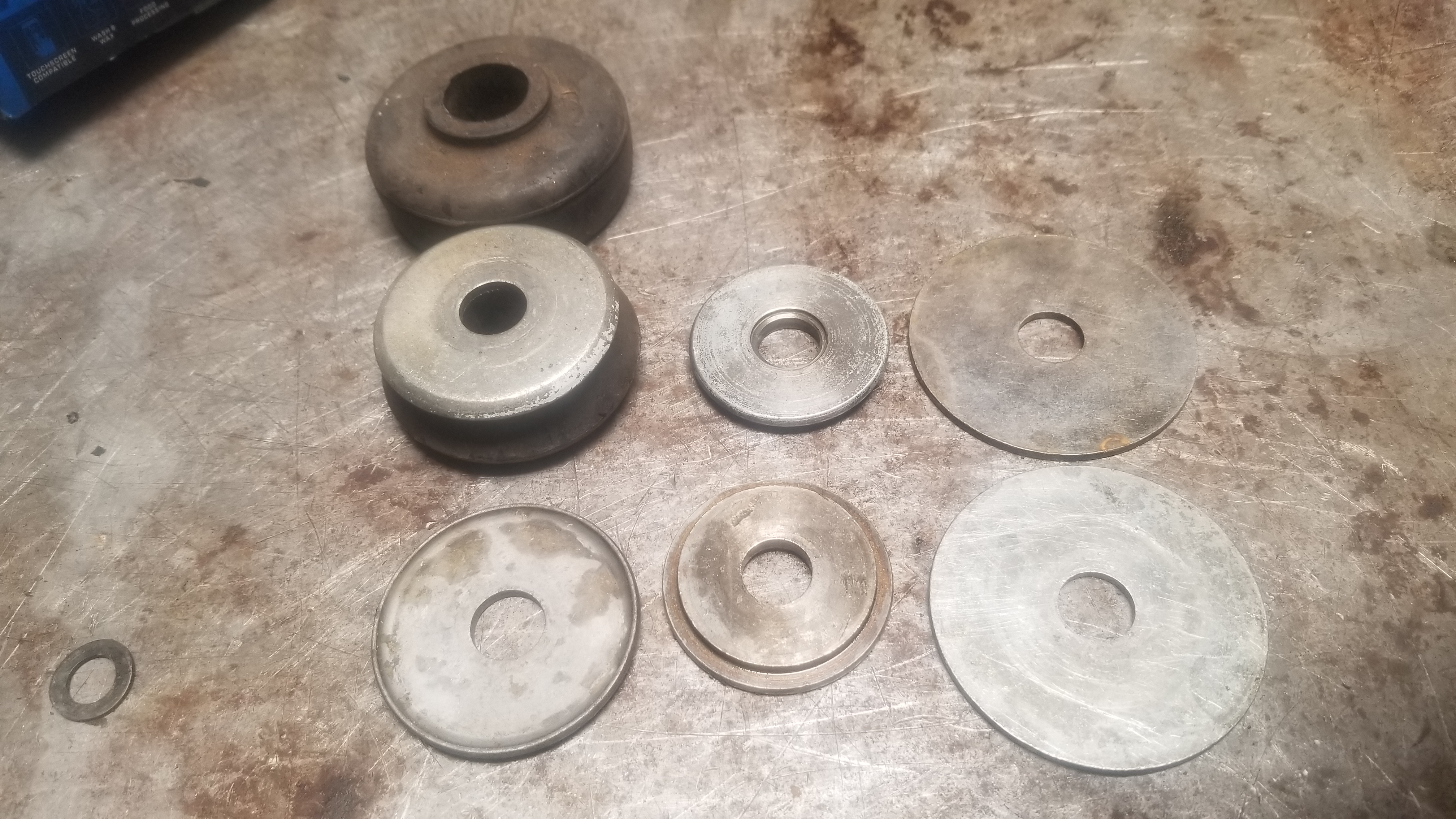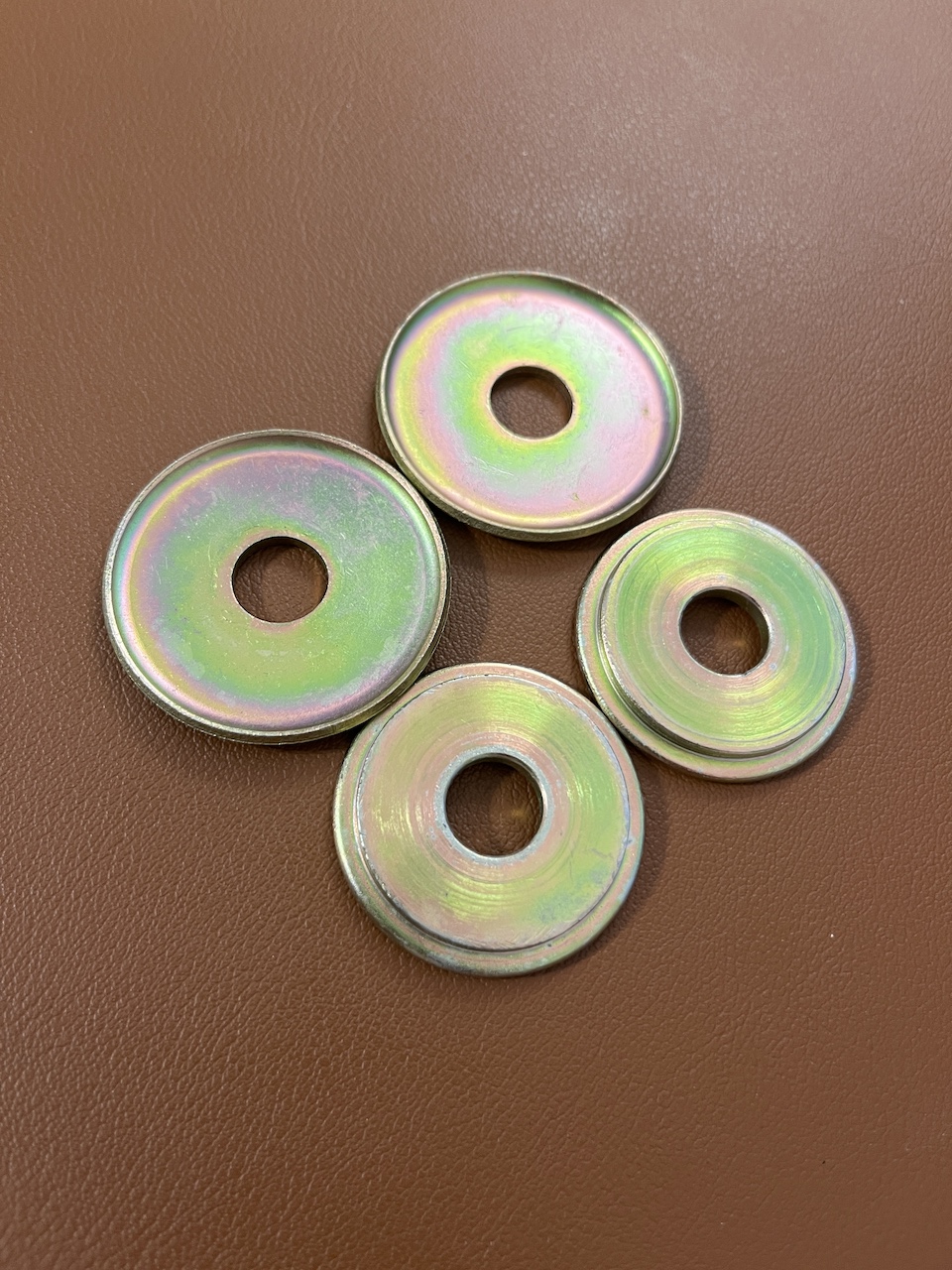 The PO of our car swapped out and removed a bunch of stuff. I have a stash of various large washers I can pick through, but can't find specs to know what's correct. They all appear to be NLA, so hard to even find pictures. Are any of these unique in that they're concave or slotted?