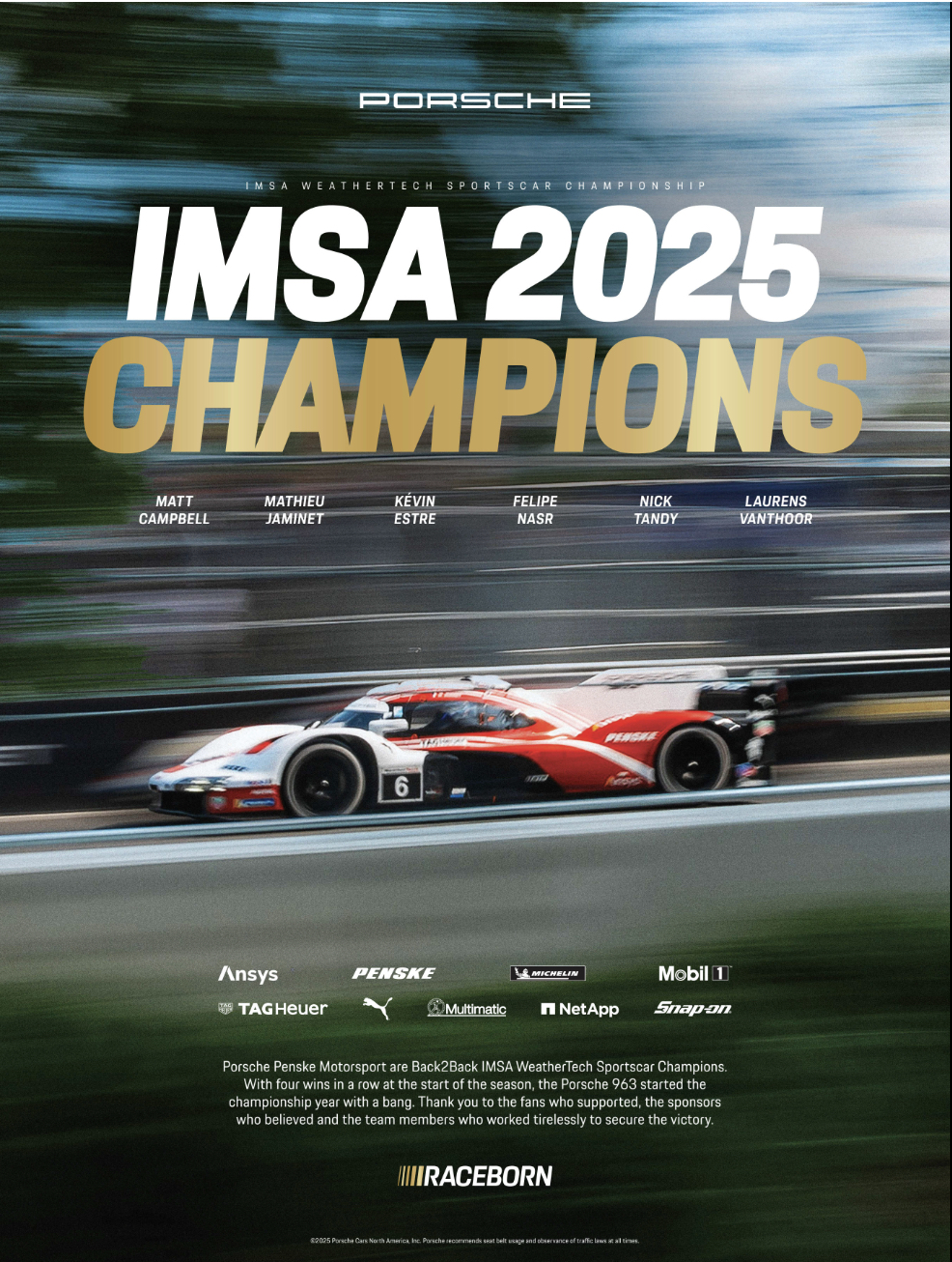 People from other car marques ask me both why Porsche for me, but also for so many others. Why Porsche? Because unlike many vintage car marques, Porsche is still racing and still winning. There is a reason they have won Le Mans more time than anyone else, they were built to race from the beginning, and they've never stopped! IMSA 2025 Champions, a trifecta. Porsche Penske Motorsport has taken all three 2025 IMSA WeatherTech SportsCar Championship titles: Drivers’, Teams’, and Manufacturers’. Raceborn indeed!