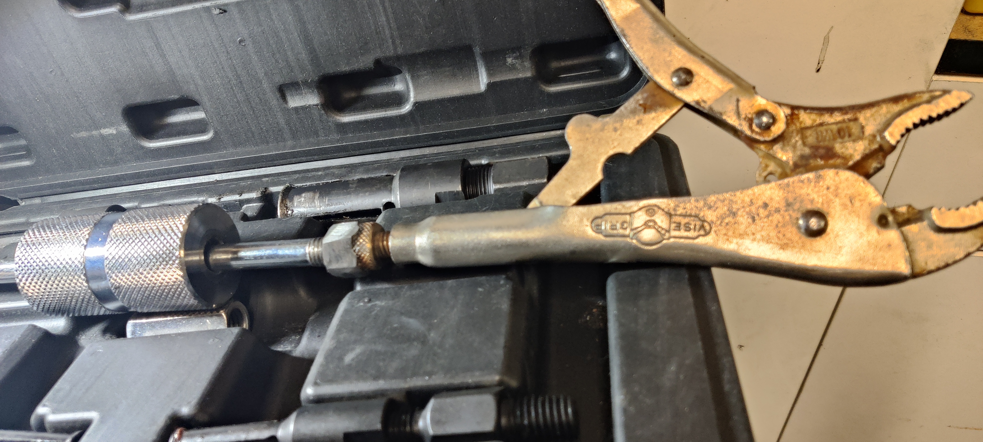 Here's a modified grease cap that's setup for a slide hammer too, and similar to the vice grips, and after discovering 930 grease caps. Can't remember if it made me think about modifying the vice grips?