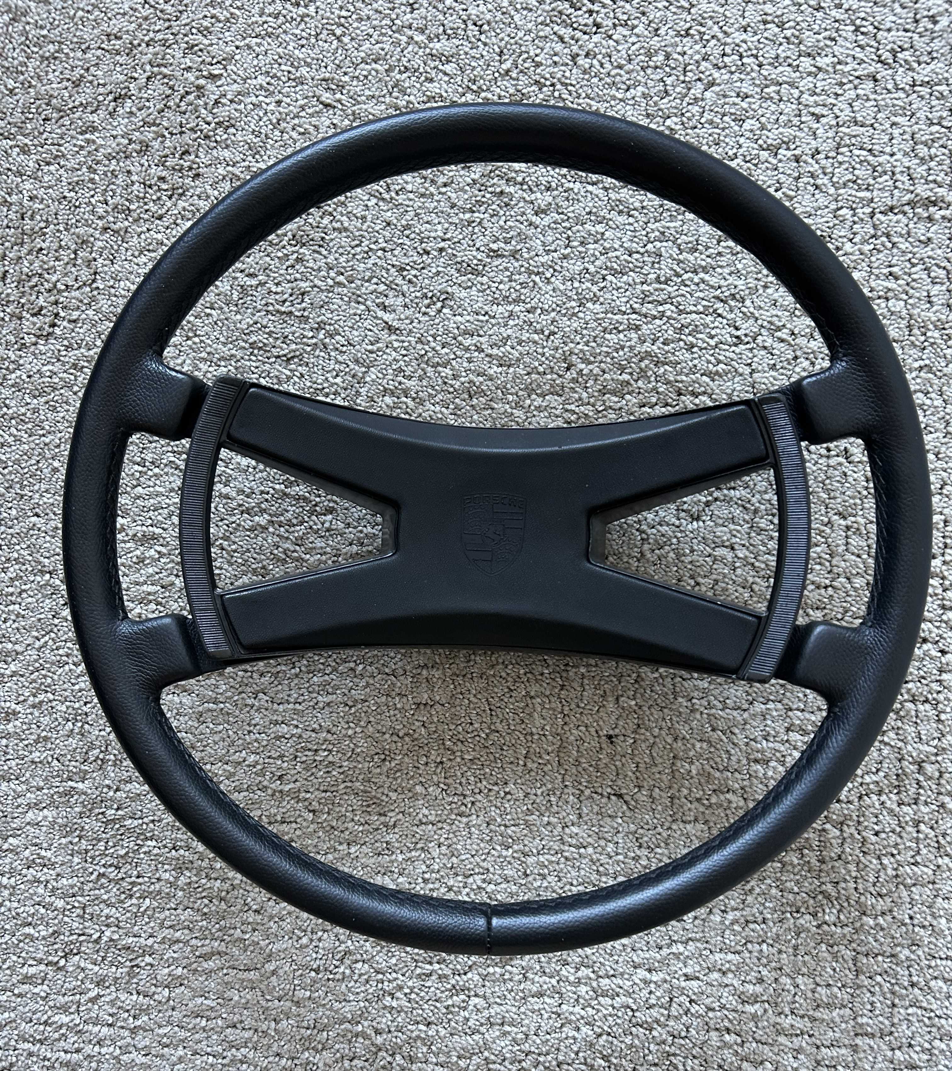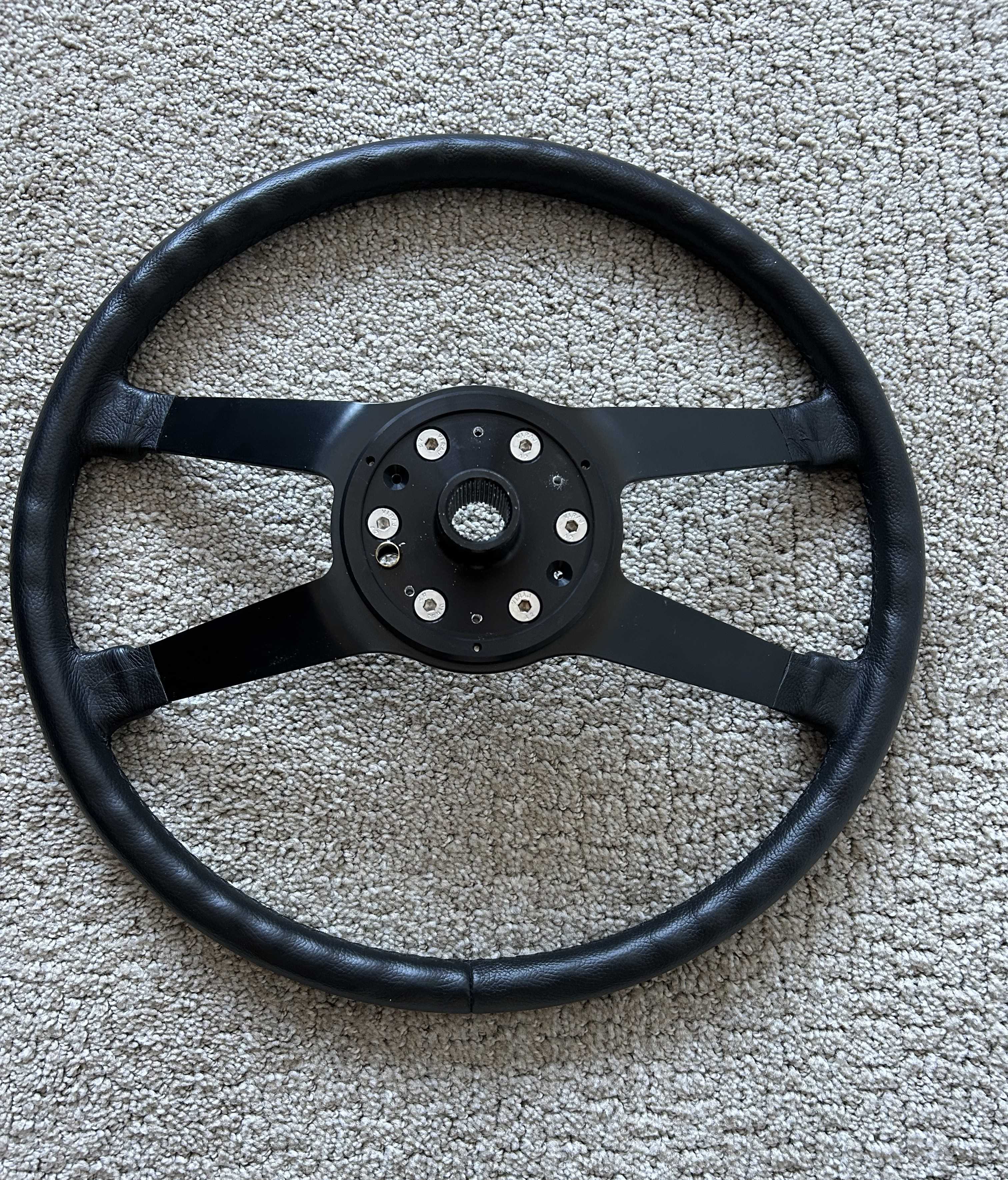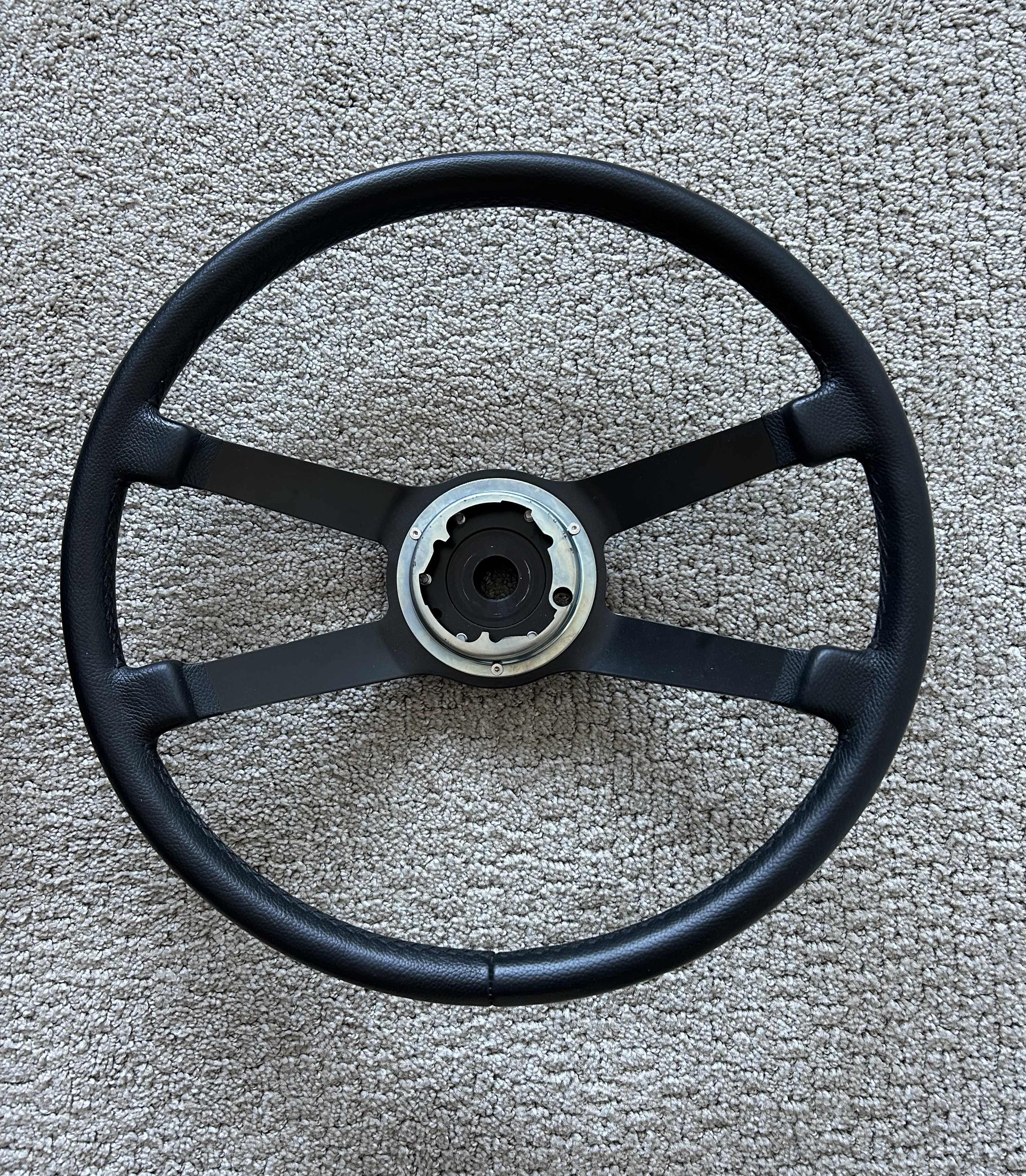 SOLD!! This 380mm leather wrapped steering wheel came on my '70 914 and I decided to install my thick grip wheel I already had. Wheel is standard grip size and in "as new" condition and was purchased by PO from Sierra Madre for $665.00 can be used on 914, 914-6 and 911's it has the the 2 holes already drilled for the cancel ring. I will throw in a nice butterfly horn button with all attaching hardware and include shipping in the USA for $495.00