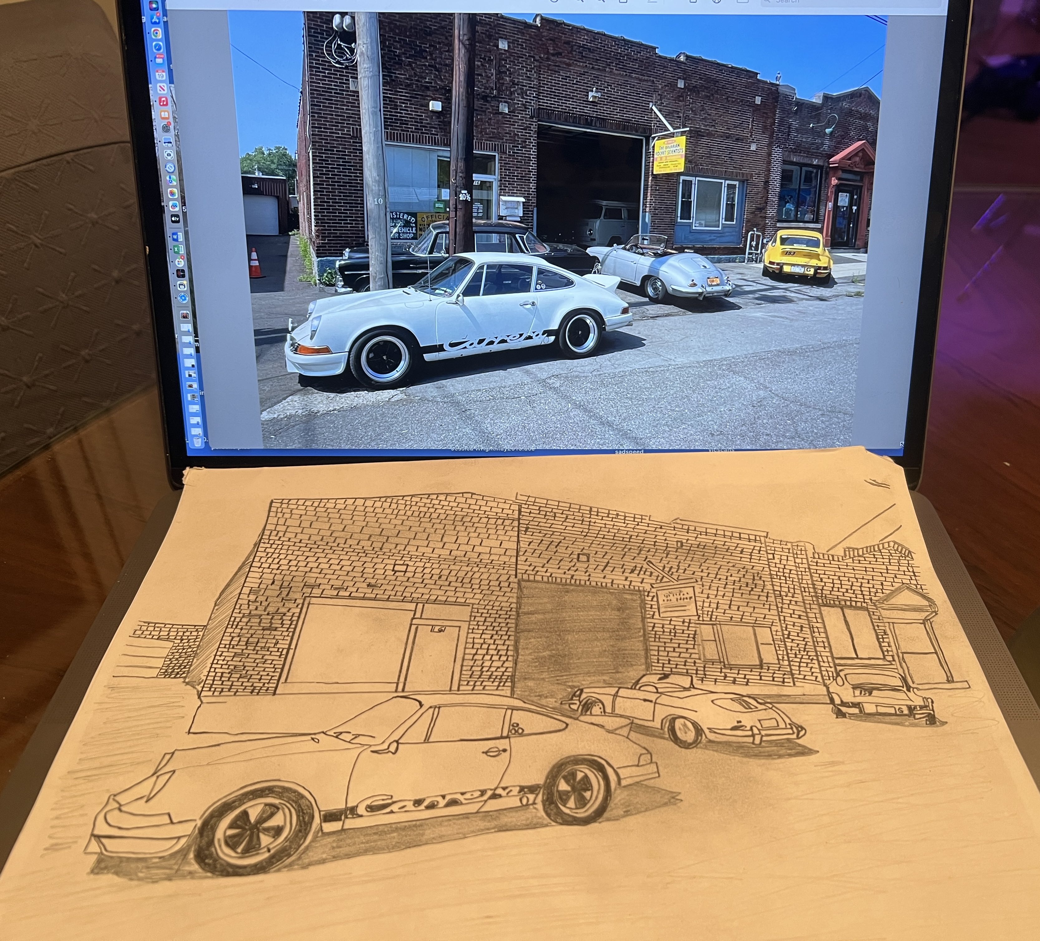 Christmas came early for my friend and mechanic Richard Dobush I presented him with a pencil drawing I did of his shop on a fun day. The 356 Roadster in the middle is mine, the 911 on the right is his. Always something cool happening at Bavarian Rocket Science!