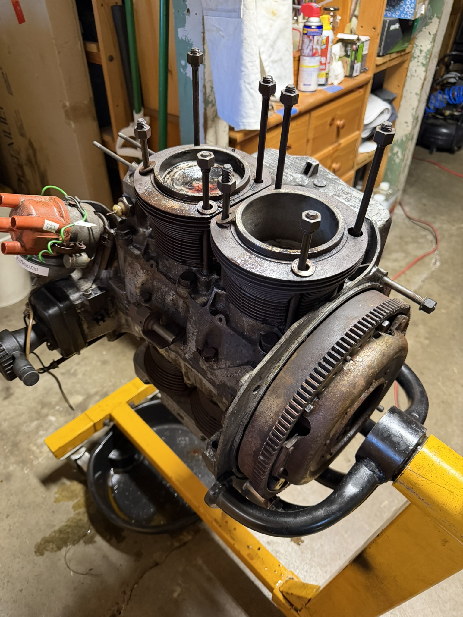 Hi, first post ever. A friend at C&C told me to reach out. Heard this forum will help. I bought a 1974 1.8 914 in March of 2025. It is now totally disassembled, and I am struggling with getting the engine taken apart. I cannot remove the cylinder heads, the flywheel does not turn, and the pistons do not move at all. In the last two months I tried, PB Blaster in the cylinders, also filled the case with it. I also filled the case with transmission oil and Marvel Mystery oil. Leaving it sitting for weeks on end, turning it every couple of days. I warmed up the engine with a heat gun, gently tapped the cylinder heads, also tapped the pistons. All with no success. It seems the cylinder heads are glued to the case, not one is moving. The former owner planned to replace the engine with a different one, but I am interested in bringing it back. When I drained the oil, I got about a quart of water (the car was in a field for 4 years) and a little bit of oil. Supposedly it ran 4 years ago. I am planning to attach a lever to the flywheel next, but I don't want to damage the crankshaft. I have not tried a torch yet, not sure if it will damage the case. I am also hearing different places, either the bottom of the cylinders or the case to be warmed up with the torch. The cylinder head insides are pretty rusted and will need to be replaced anyway, but I am hoping that the crank case is still ok. Very similar situation with the one I had recently. I had only one cylinder that would not come off. I placed it in this exact position and poured Mystery Oil and left it sit for 24-48 hours around that time. applied some heat after removing all the mystery oil (almost none made it through the rings) and kept tapping with a rubber/wood mallet. eventually came loose. The piston rings had rusted to the cylinder head in my case so the only way to get it off was that. if you have more than one cylinder rusted I can imagine that would be very hard to break the rust off the rings if one moves but the other doesnt. My case was only one so after i broke that free it came apart. Good luck mate. |