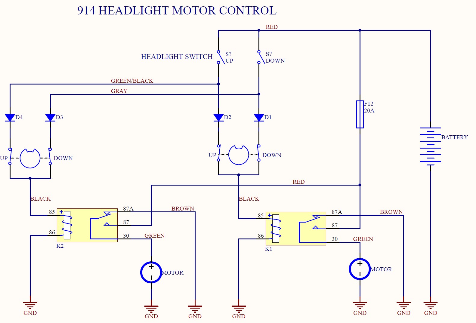 A fuzzy schematic showing the connections for the motors at the headlight switch.