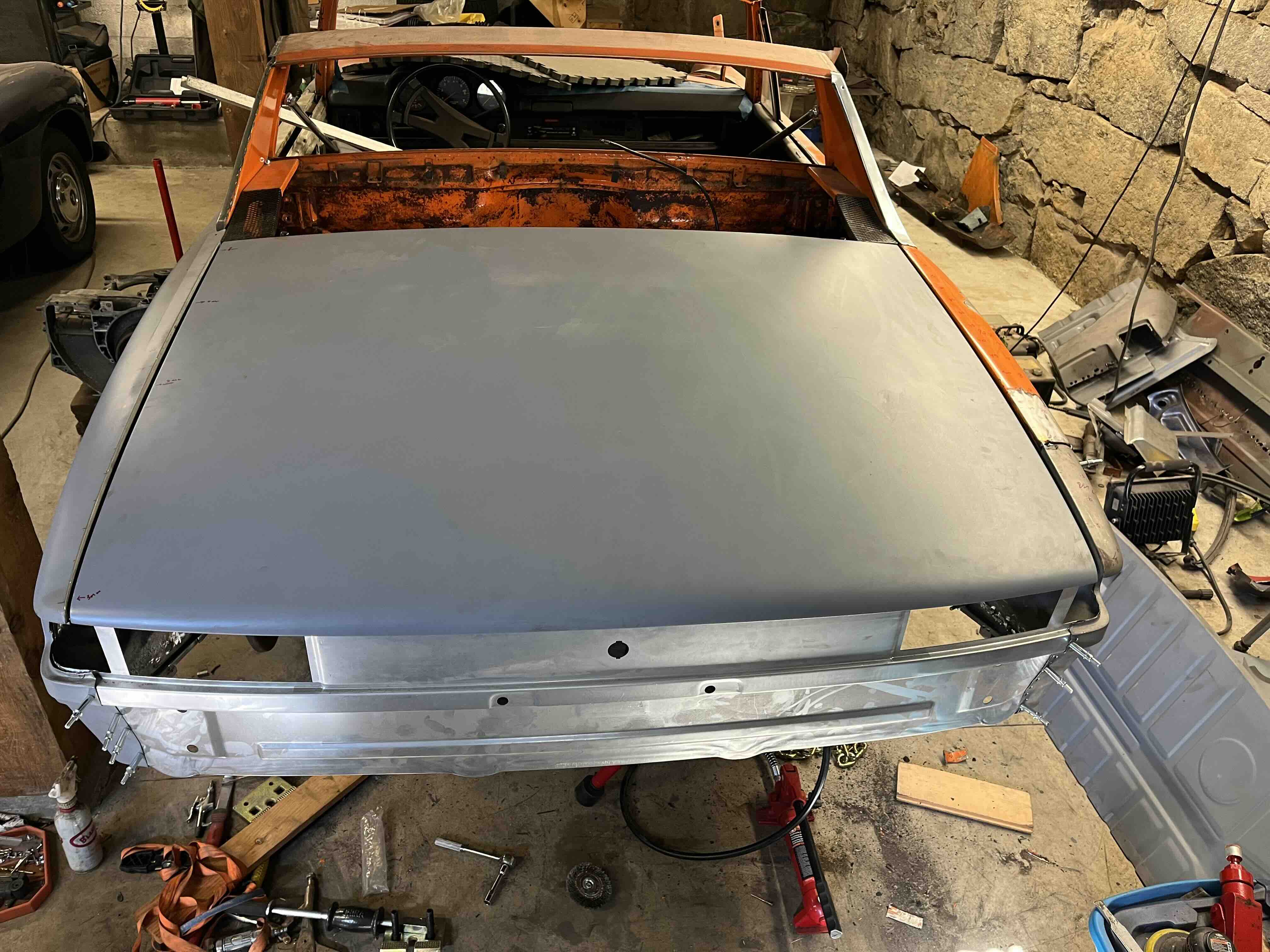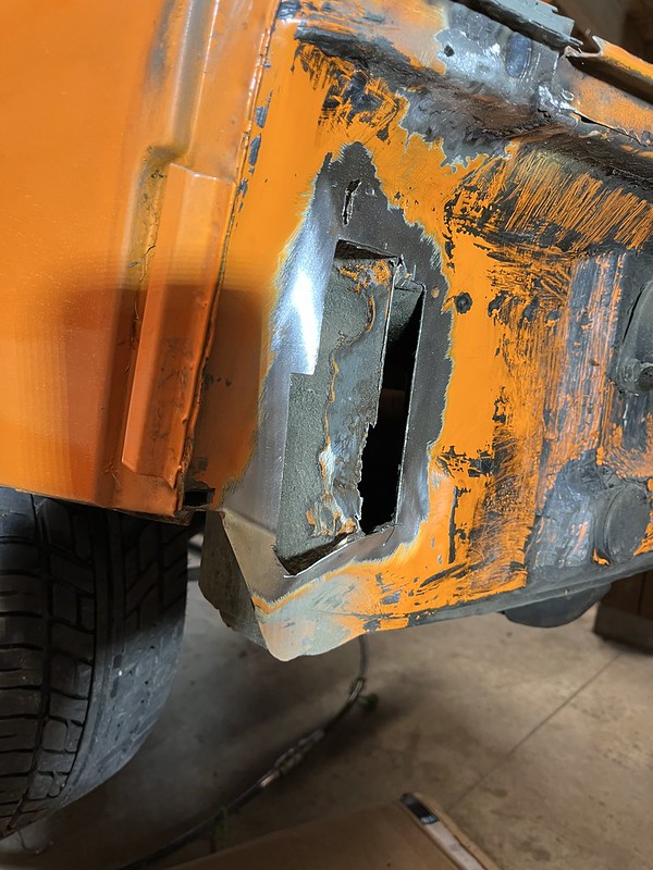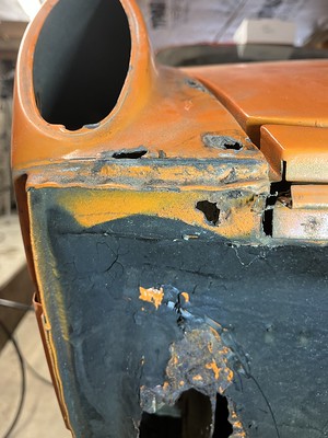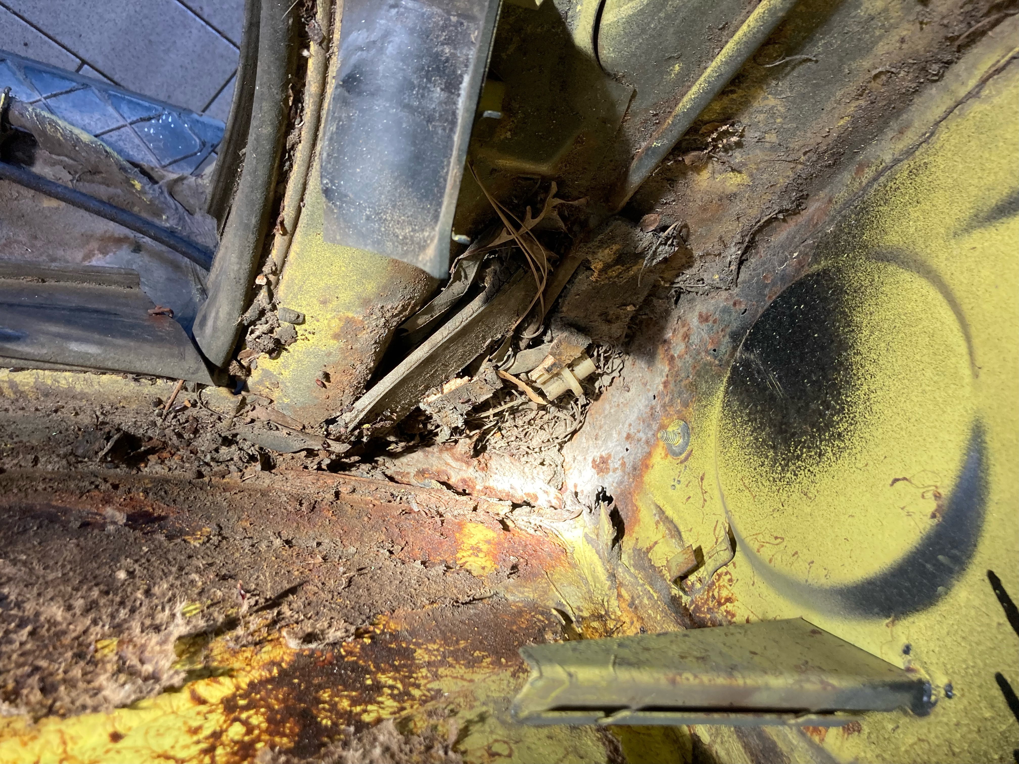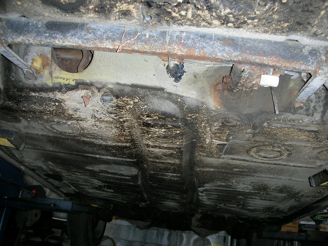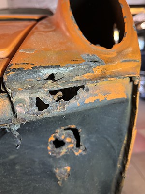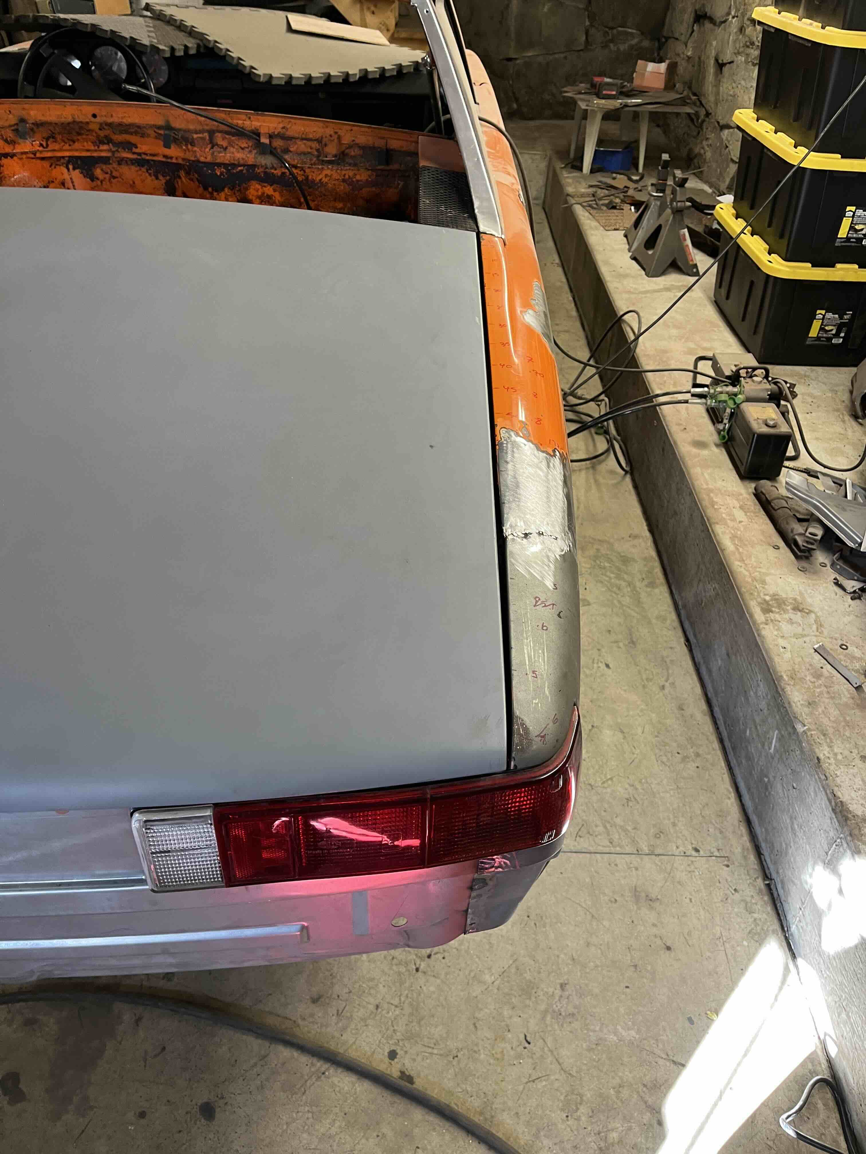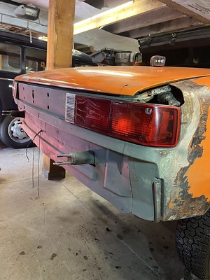 Photos below tell the story but the worst of the rust appears to be in the aft section of the LH outer longitudinal. I haven’t pulled the battery and ECU out yet, but from what I can see underneath the car, inside the engine bay, and between the quarter panel and the engine compartment tin the hell hole appears solid (but I’m prepared to find surprises). The rear of the car seems worst off with rot from the foam above the tail lights partially cut out and partially corrected (I’ll be cutting that all back out and starting the job fresh). It was also hit from behind on the LH side and although I haven’t measured everything out yet, from what I can see underneath things don’t seem to be out of whack (maybe wishful thinking as the panel gaps for the rear trunk are uneven). The trunk lid itself somehow didn’t rust out along the rear edge, but it’s suffered a lot of abuse in the form of a now missing luggage rack and a black fiberglass spoiler that had been attached with wood screws. The front of the car doesn’t show any signs of impact damage but the trunk lid sits high when latched on the LH side.