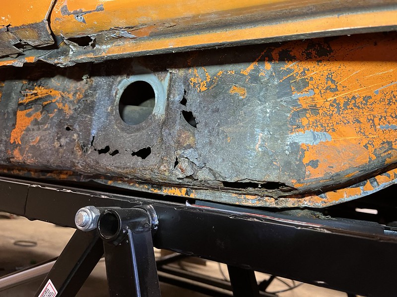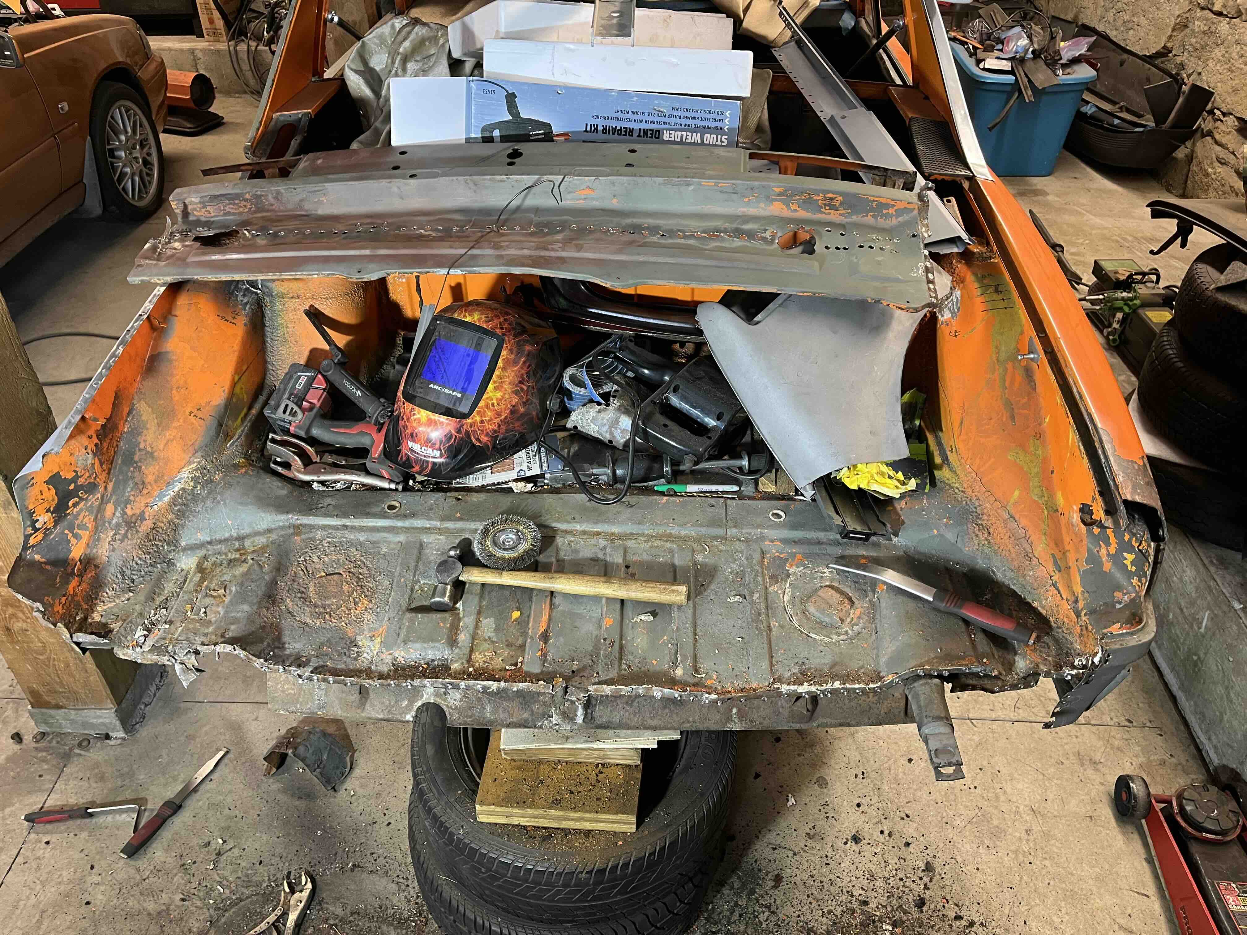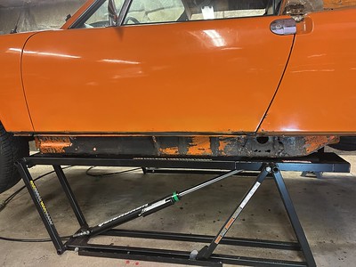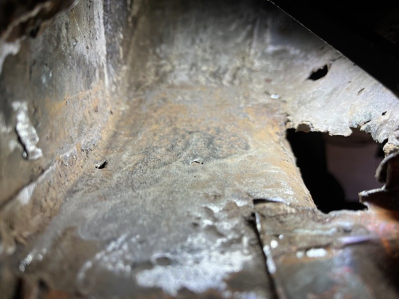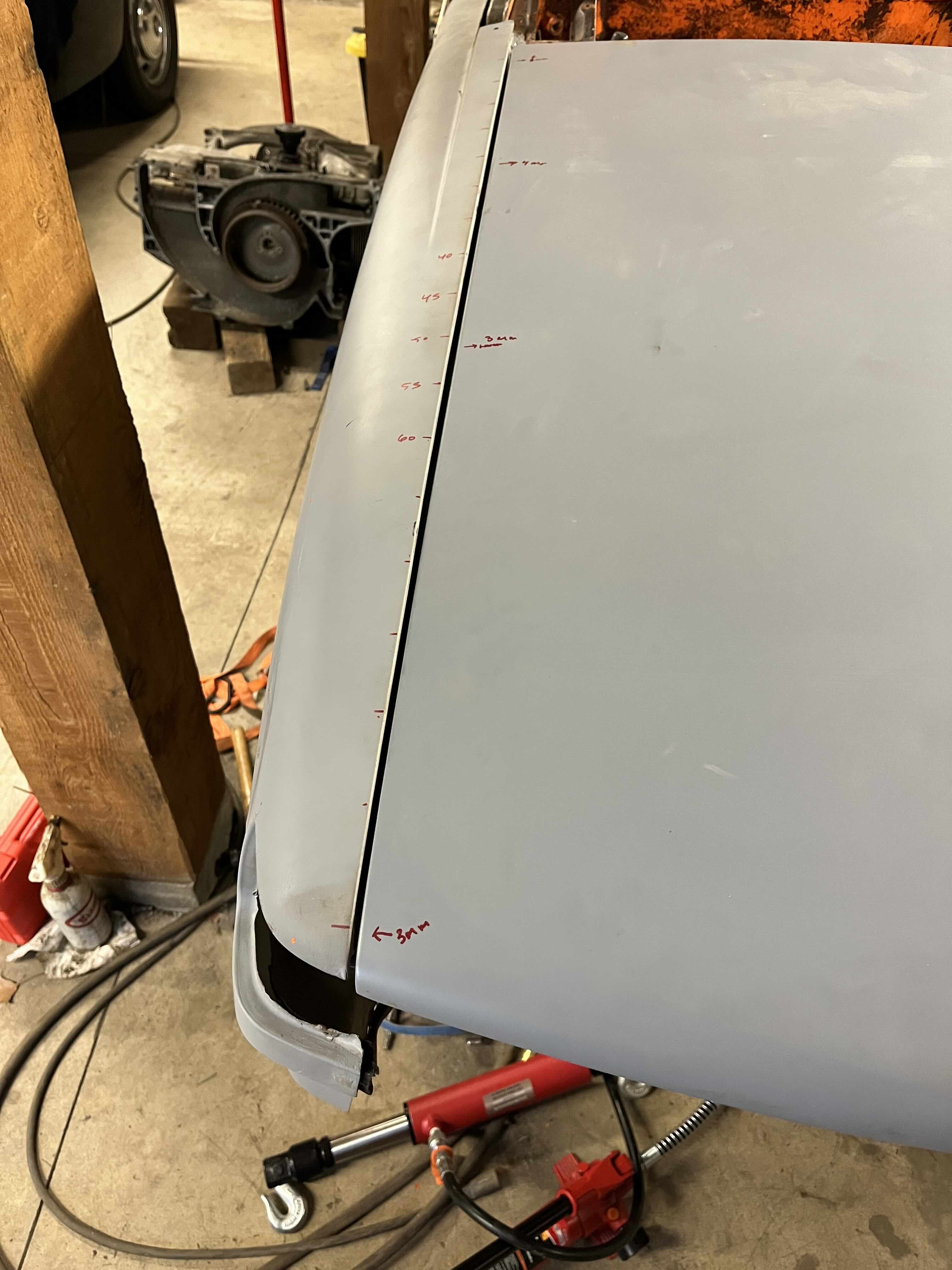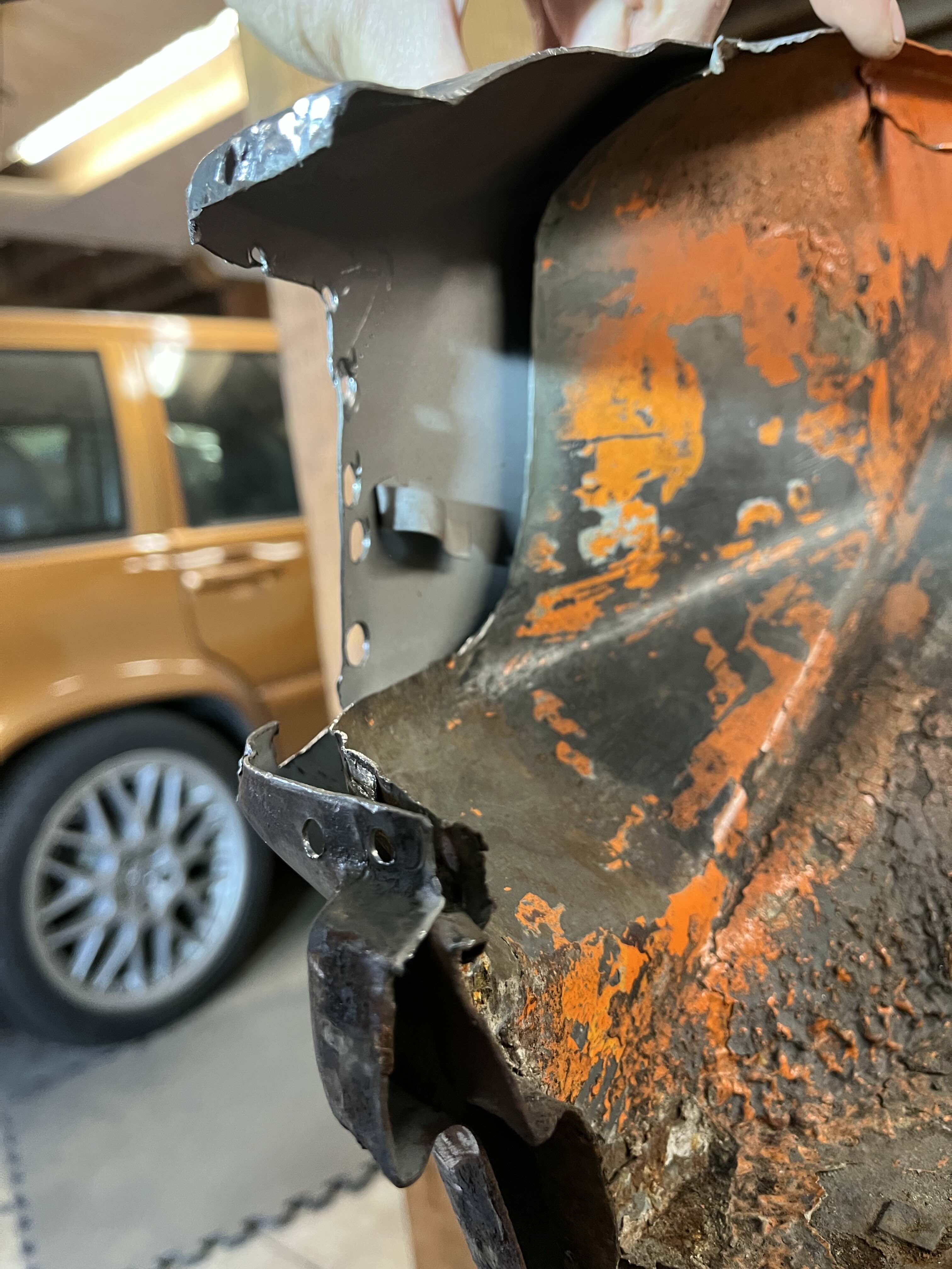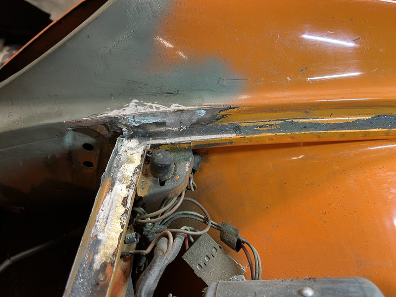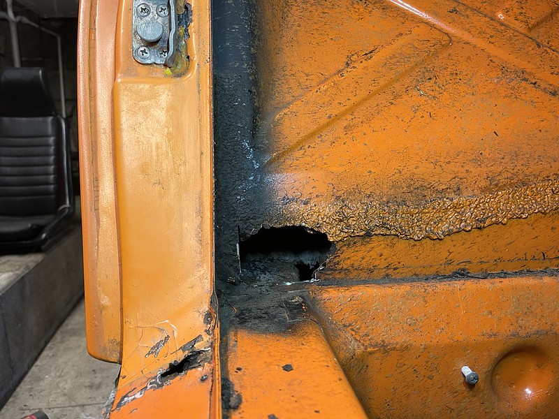Photos below tell the story but the worst of the rust appears to be in the aft section of the LH outer longitudinal. I haven’t pulled the battery and ECU out yet, but from what I can see underneath the car, inside the engine bay, and between the quarter panel and the engine compartment tin the hell hole appears solid (but I’m prepared to find surprises). The rear of the car seems worst off with rot from the foam above the tail lights partially cut out and partially corrected (I’ll be cutting that all back out and starting the job fresh). It was also hit from behind on the LH side and although I haven’t measured everything out yet, from what I can see underneath things don’t seem to be out of whack (maybe wishful thinking as the panel gaps for the rear trunk are uneven). The trunk lid itself somehow didn’t rust out along the rear edge, but it’s suffered a lot of abuse in the form of a now missing luggage rack and a black fiberglass spoiler that had been attached with wood screws. The front of the car doesn’t show any signs of impact damage but the trunk lid sits high when latched on the LH side.