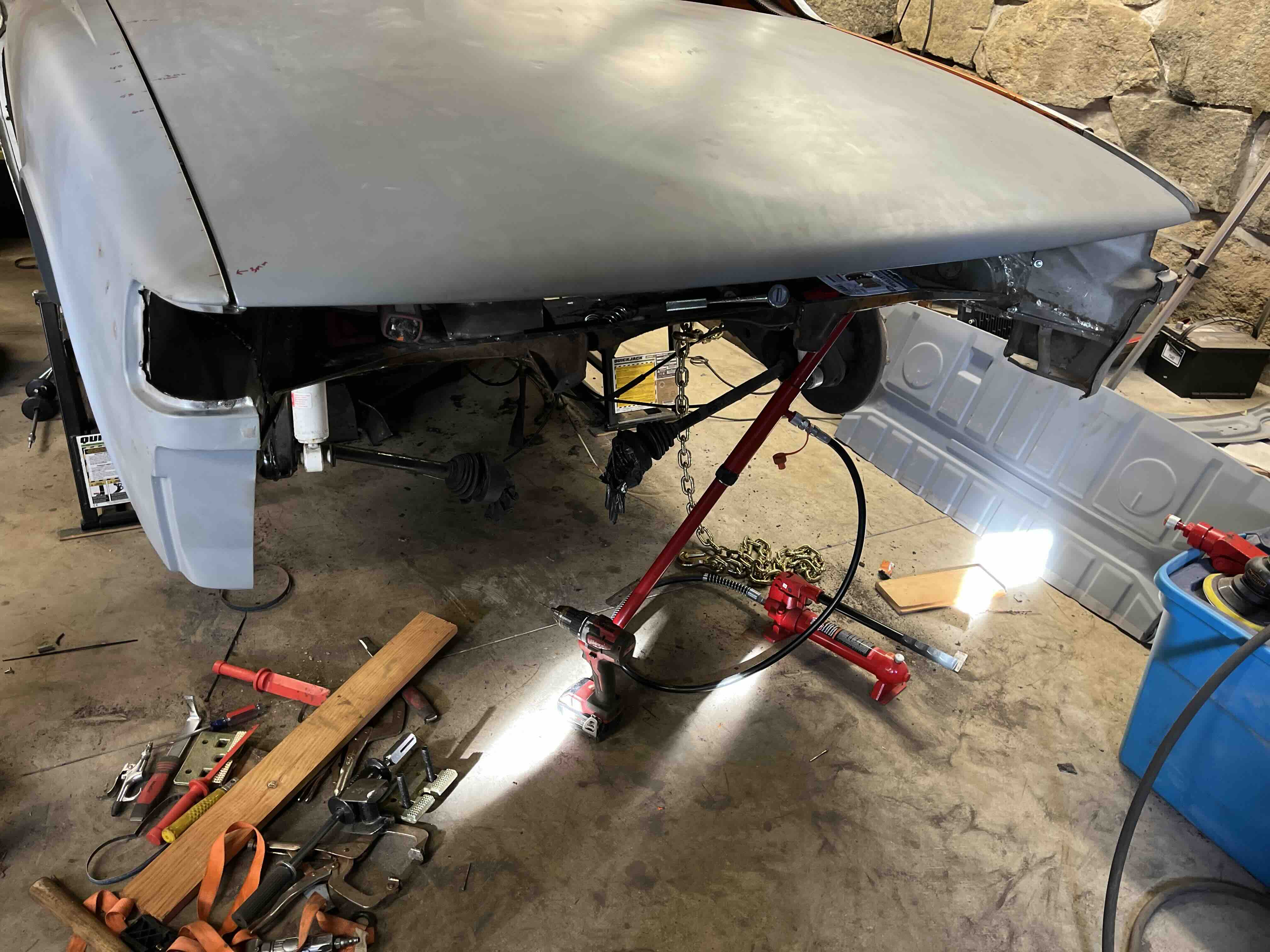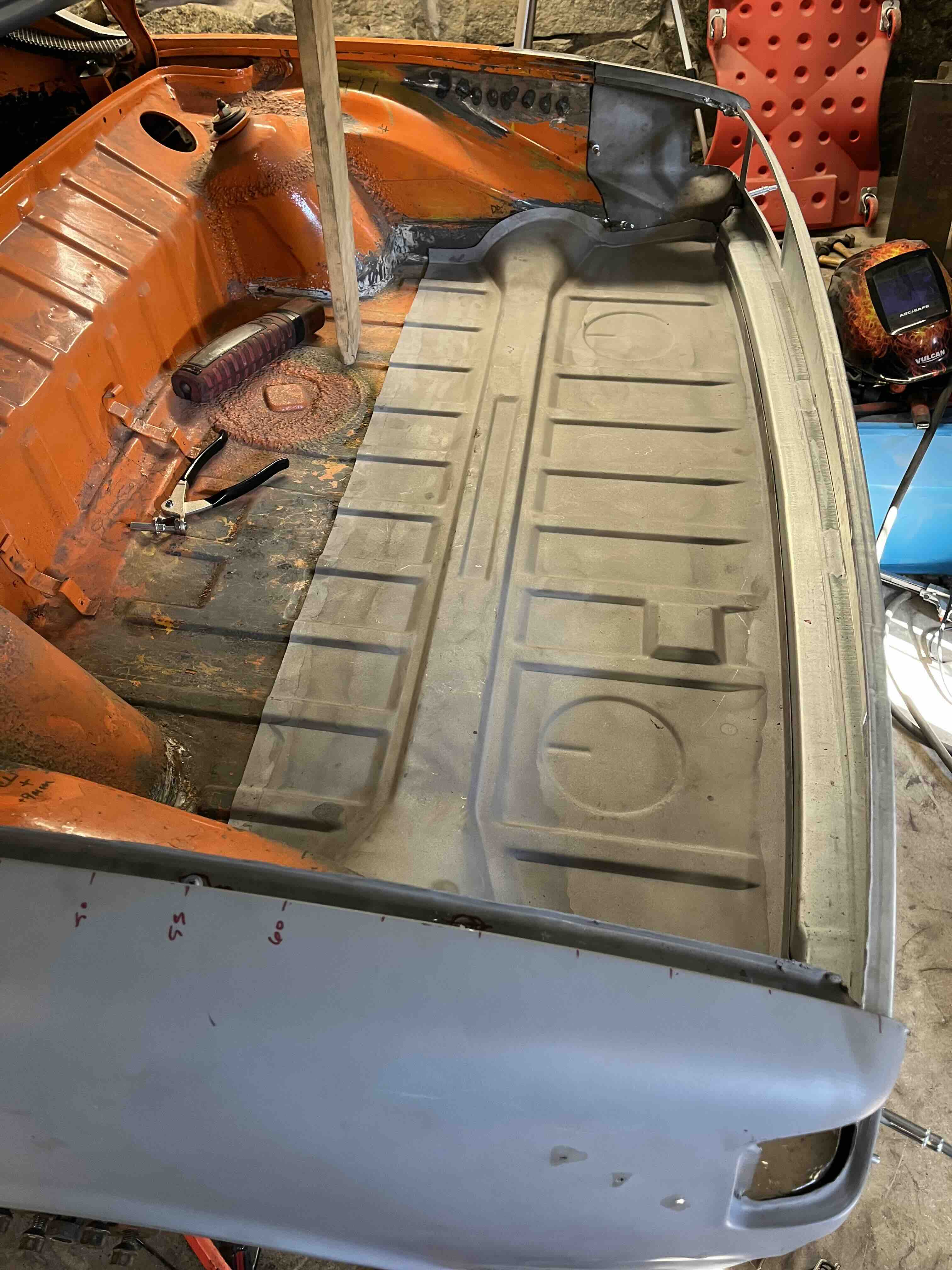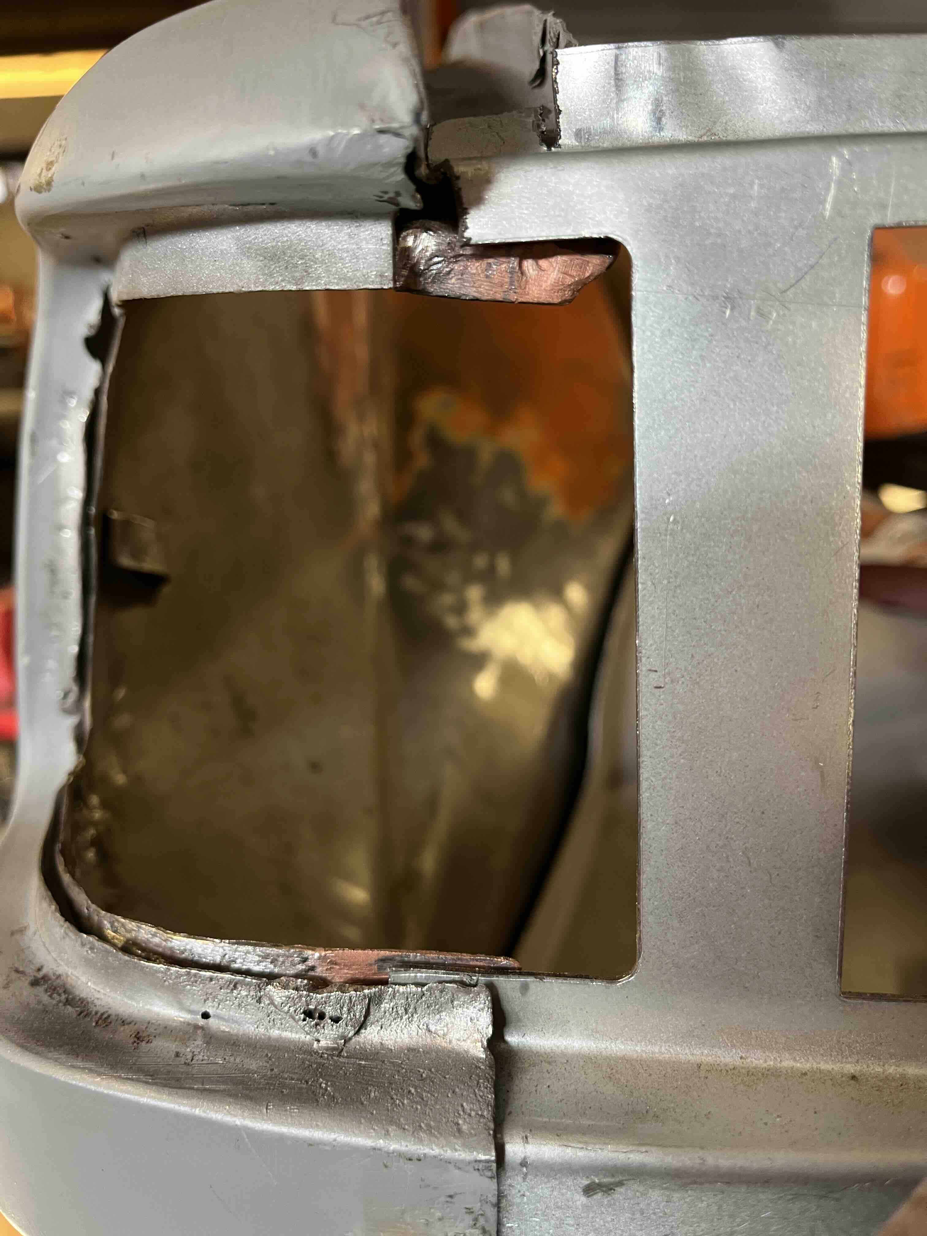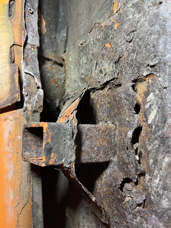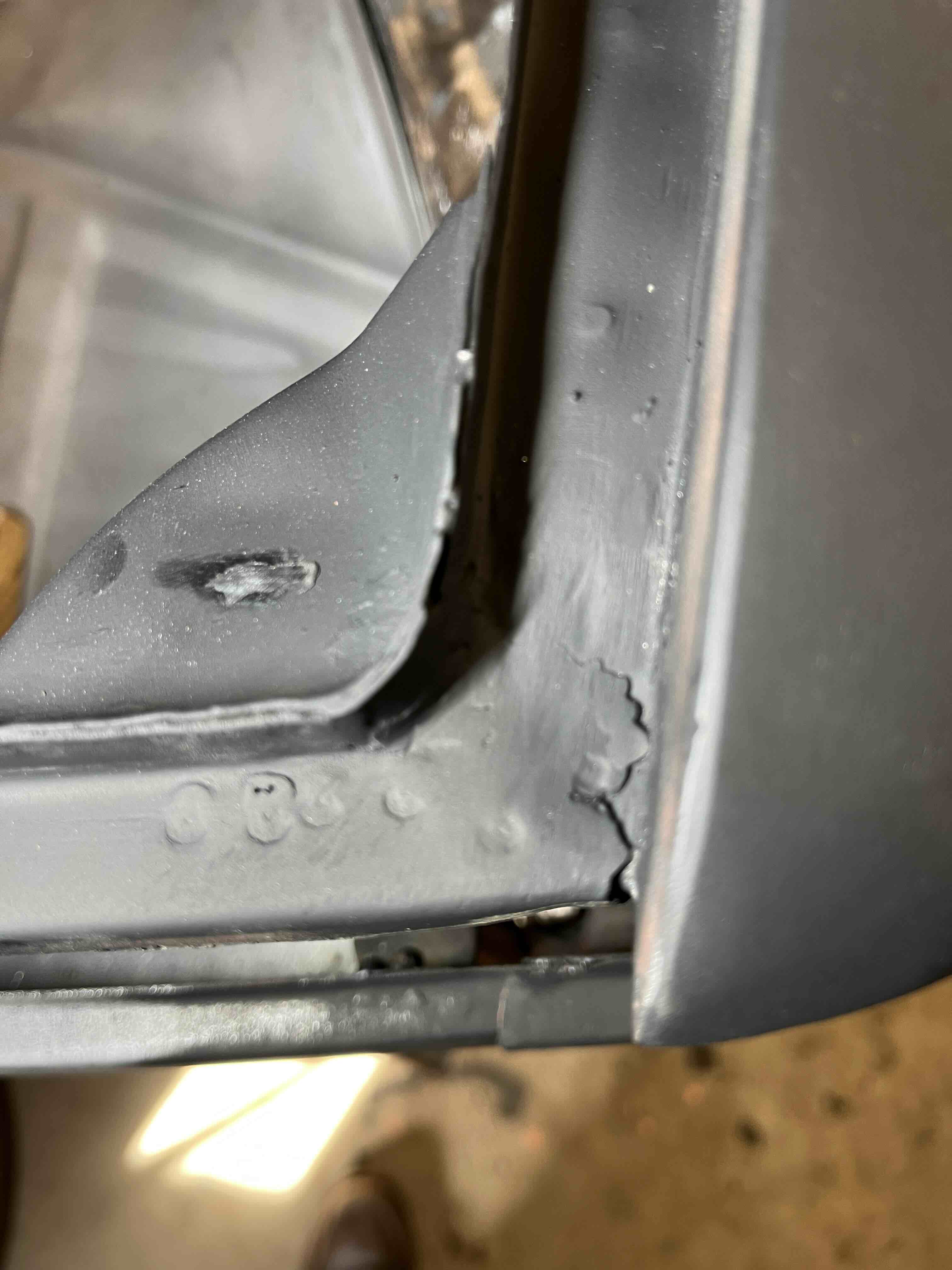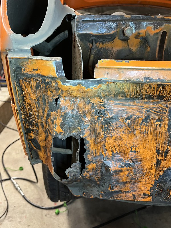 Photos below tell the story but the worst of the rust appears to be in the aft section of the LH outer longitudinal. I haven’t pulled the battery and ECU out yet, but from what I can see underneath the car, inside the engine bay, and between the quarter panel and the engine compartment tin the hell hole appears solid (but I’m prepared to find surprises). The rear of the car seems worst off with rot from the foam above the tail lights partially cut out and partially corrected (I’ll be cutting that all back out and starting the job fresh). It was also hit from behind on the LH side and although I haven’t measured everything out yet, from what I can see underneath things don’t seem to be out of whack (maybe wishful thinking as the panel gaps for the rear trunk are uneven). The trunk lid itself somehow didn’t rust out along the rear edge, but it’s suffered a lot of abuse in the form of a now missing luggage rack and a black fiberglass spoiler that had been attached with wood screws. The front of the car doesn’t show any signs of impact damage but the trunk lid sits high when latched on the LH side.