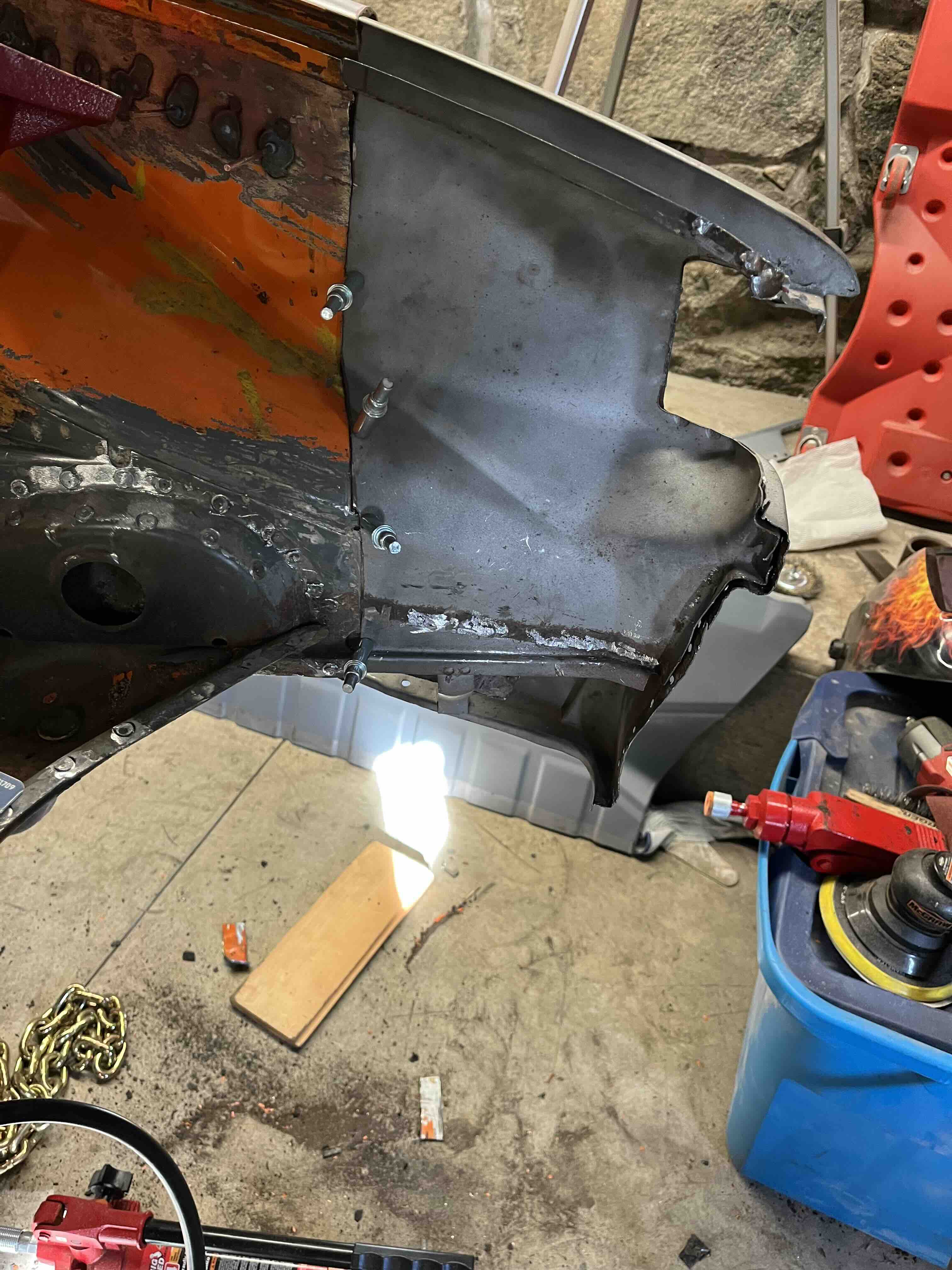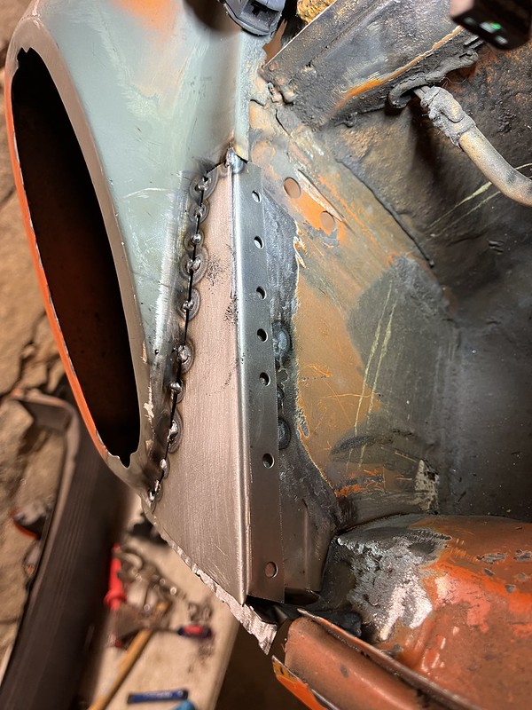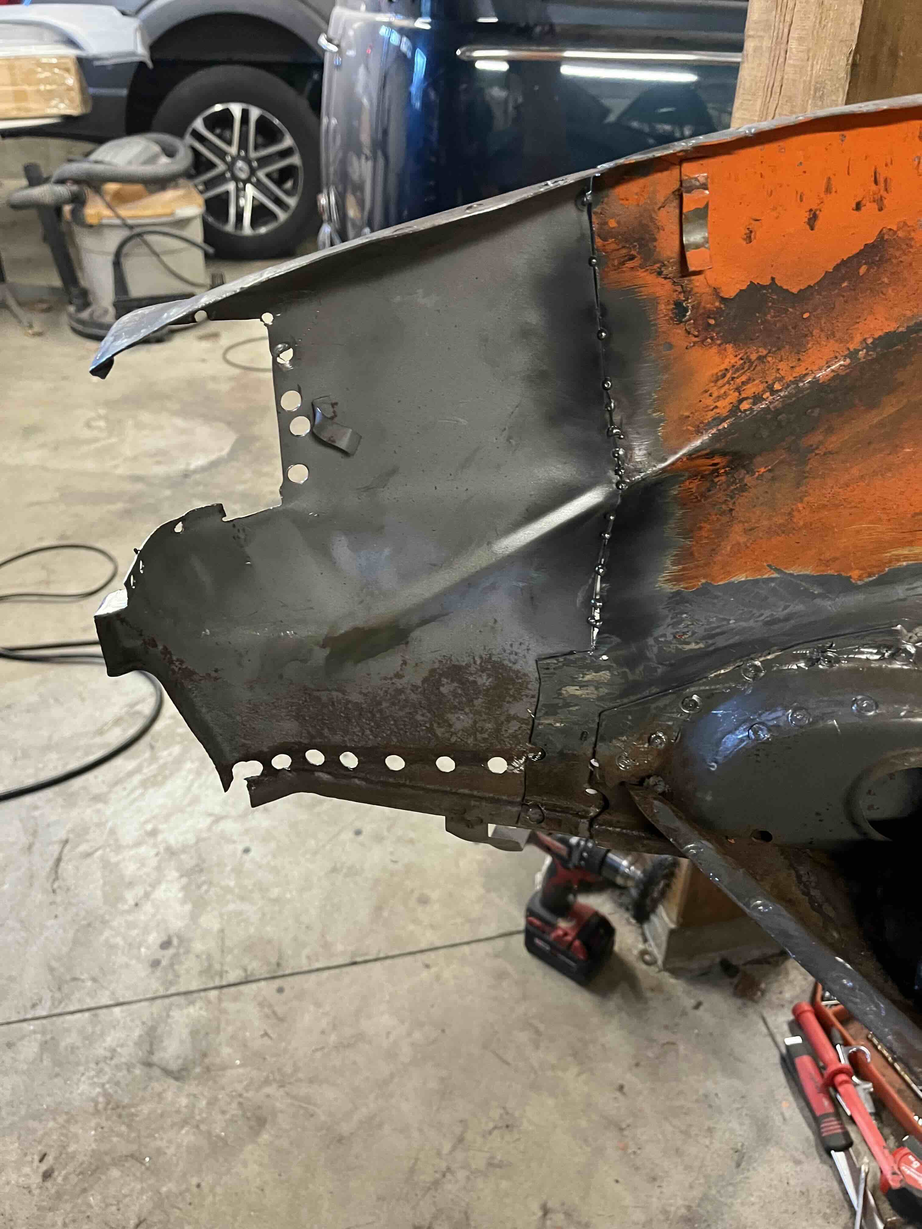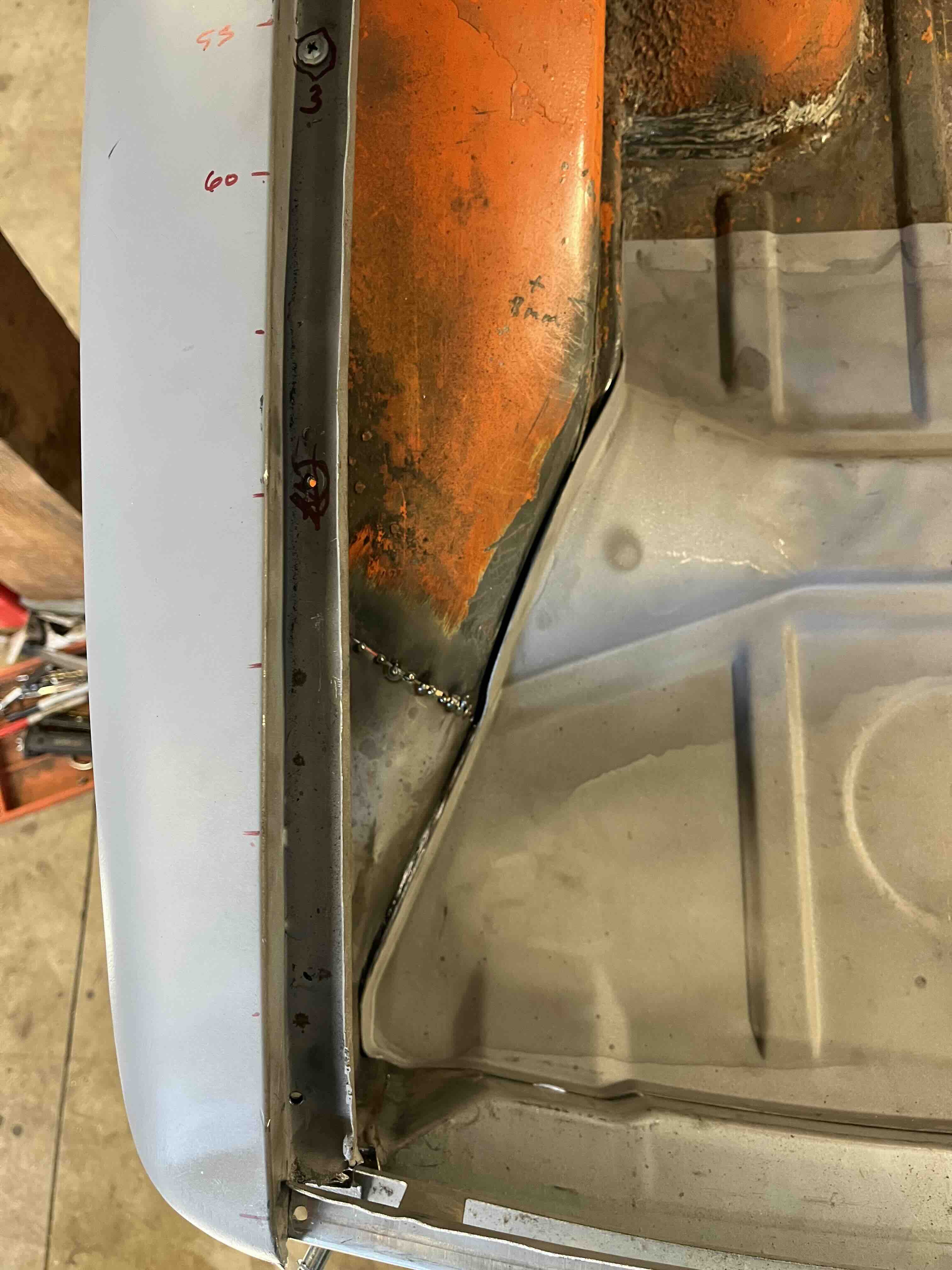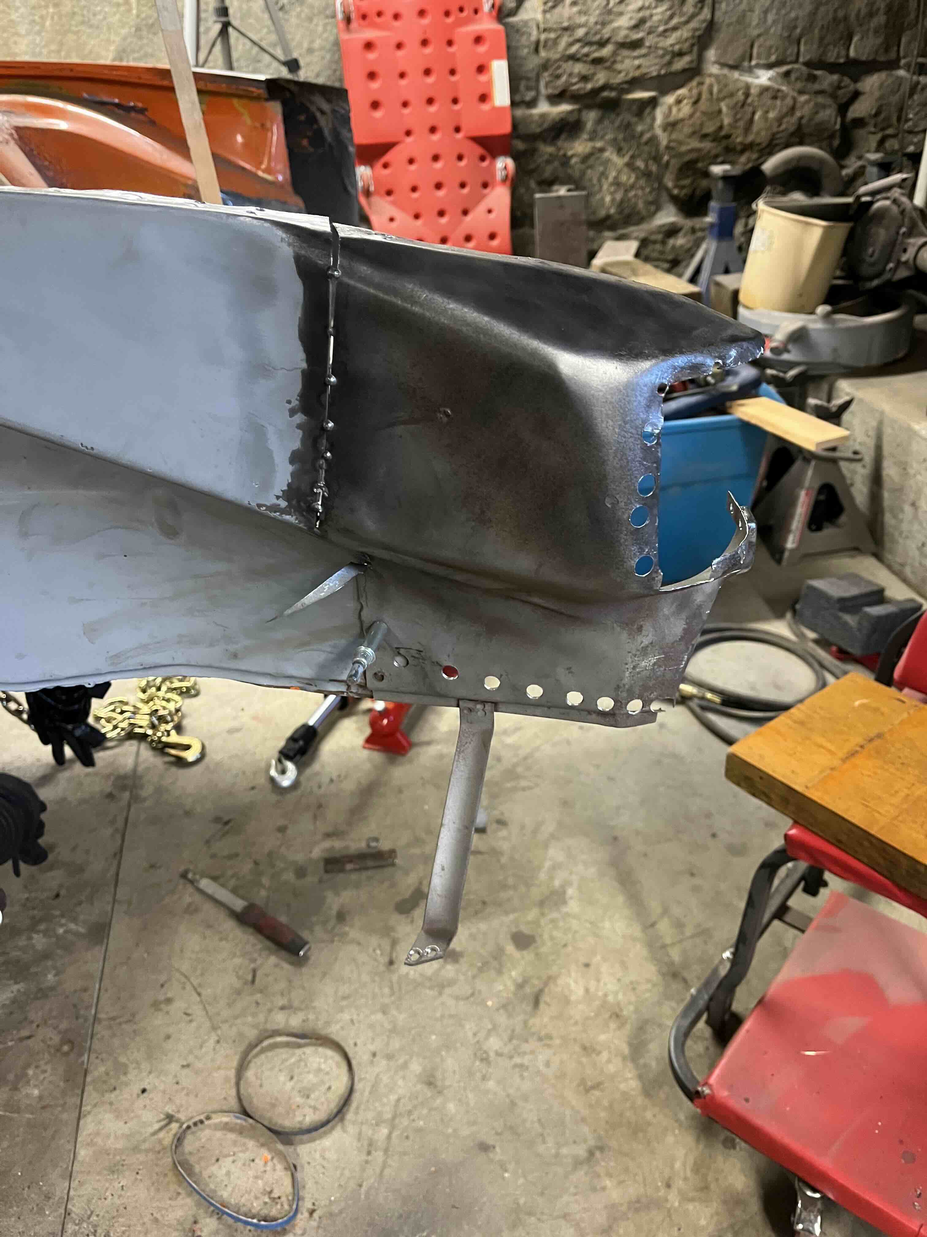 Photos below tell the story but the worst of the rust appears to be in the aft section of the LH outer longitudinal. I haven’t pulled the battery and ECU out yet, but from what I can see underneath the car, inside the engine bay, and between the quarter panel and the engine compartment tin the hell hole appears solid (but I’m prepared to find surprises). The rear of the car seems worst off with rot from the foam above the tail lights partially cut out and partially corrected (I’ll be cutting that all back out and starting the job fresh). It was also hit from behind on the LH side and although I haven’t measured everything out yet, from what I can see underneath things don’t seem to be out of whack (maybe wishful thinking as the panel gaps for the rear trunk are uneven). The trunk lid itself somehow didn’t rust out along the rear edge, but it’s suffered a lot of abuse in the form of a now missing luggage rack and a black fiberglass spoiler that had been attached with wood screws. The front of the car doesn’t show any signs of impact damage but the trunk lid sits high when latched on the LH side.